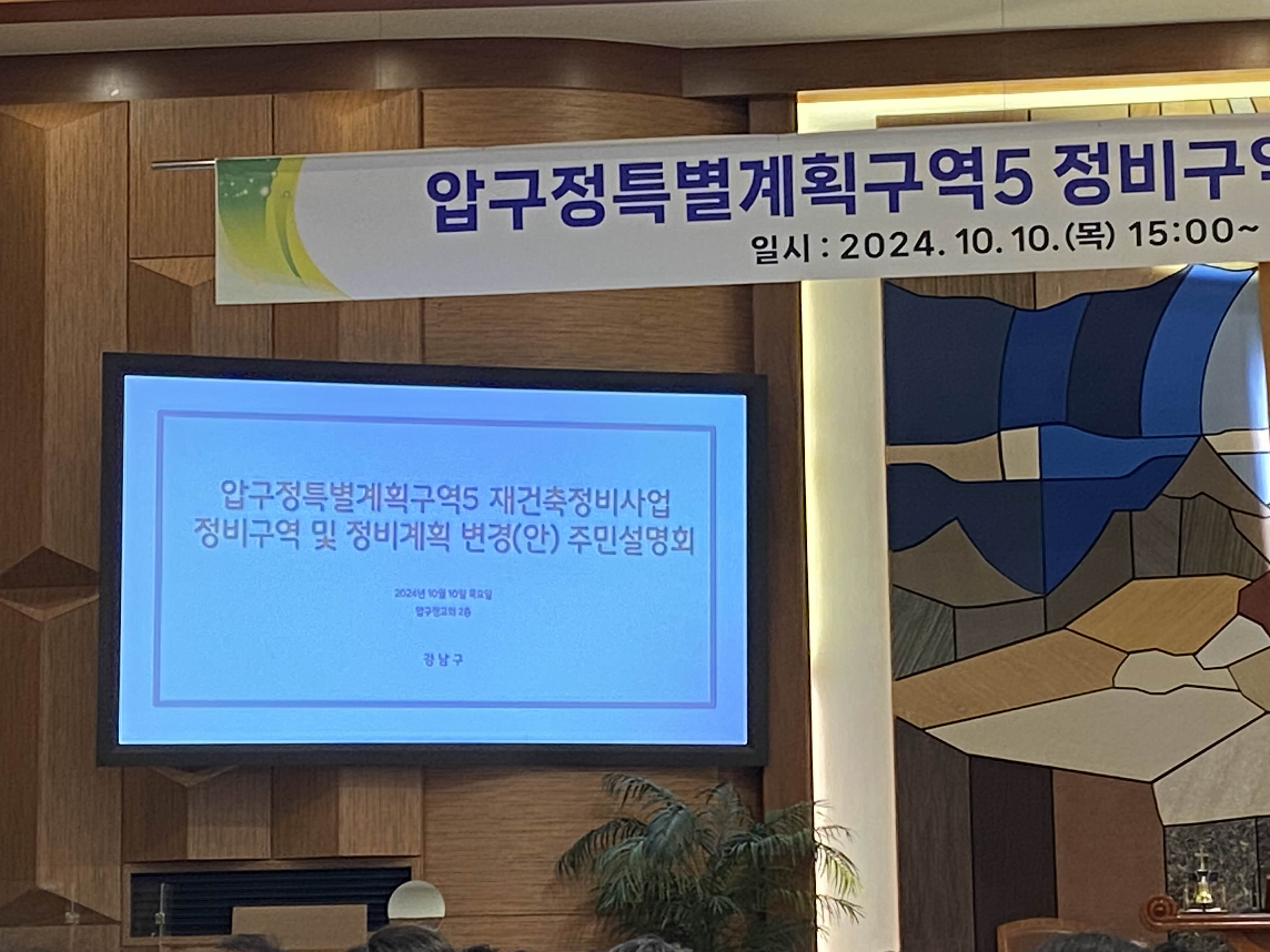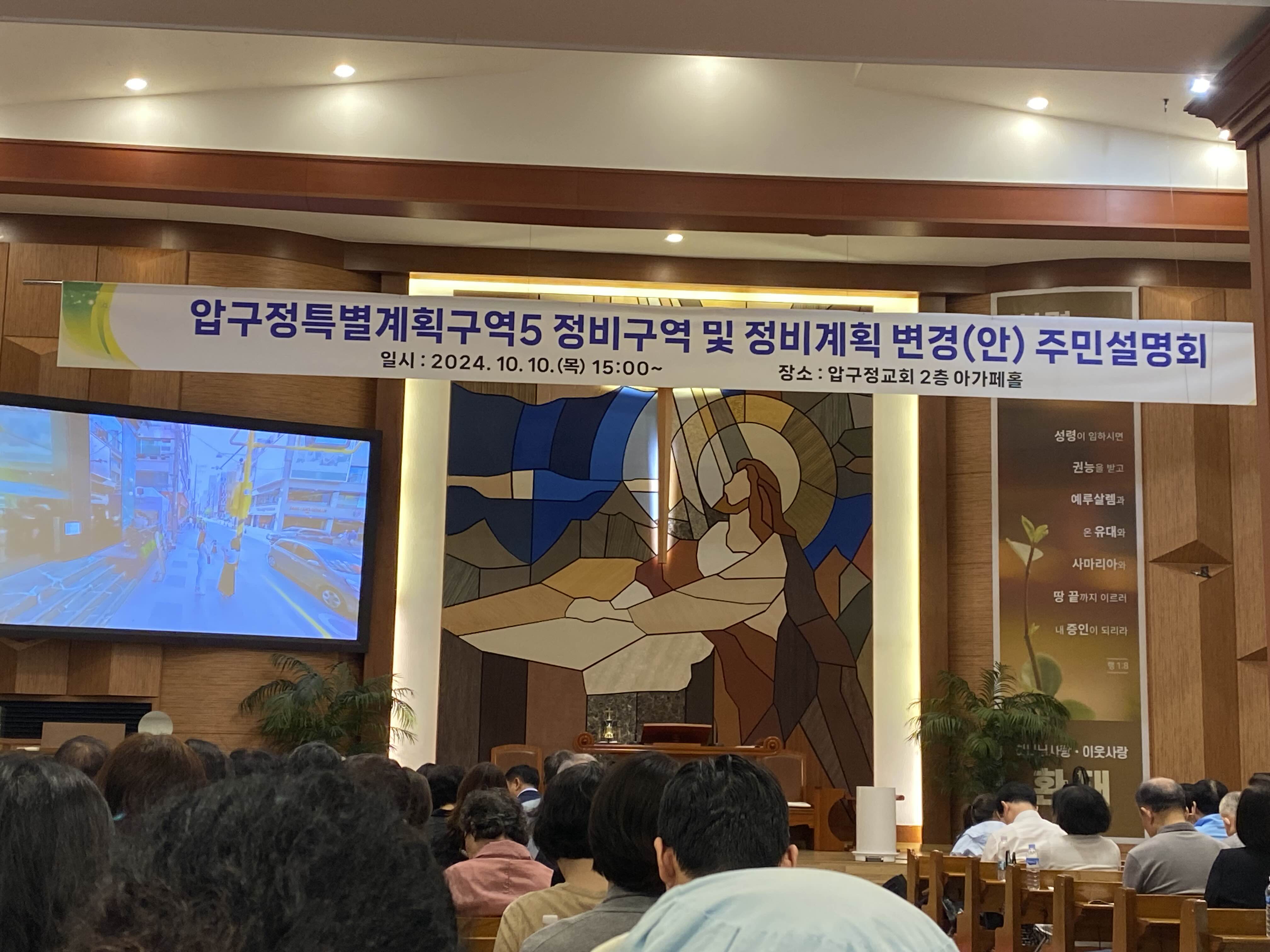2024년 10월 10일 목요일 오후 세시부터 압구정교회 2층 아가페홀에서 압구정 특별계획 구역 5 정비구역 및 정비계획 변경(안) 주민설명회가 열렸습니다.