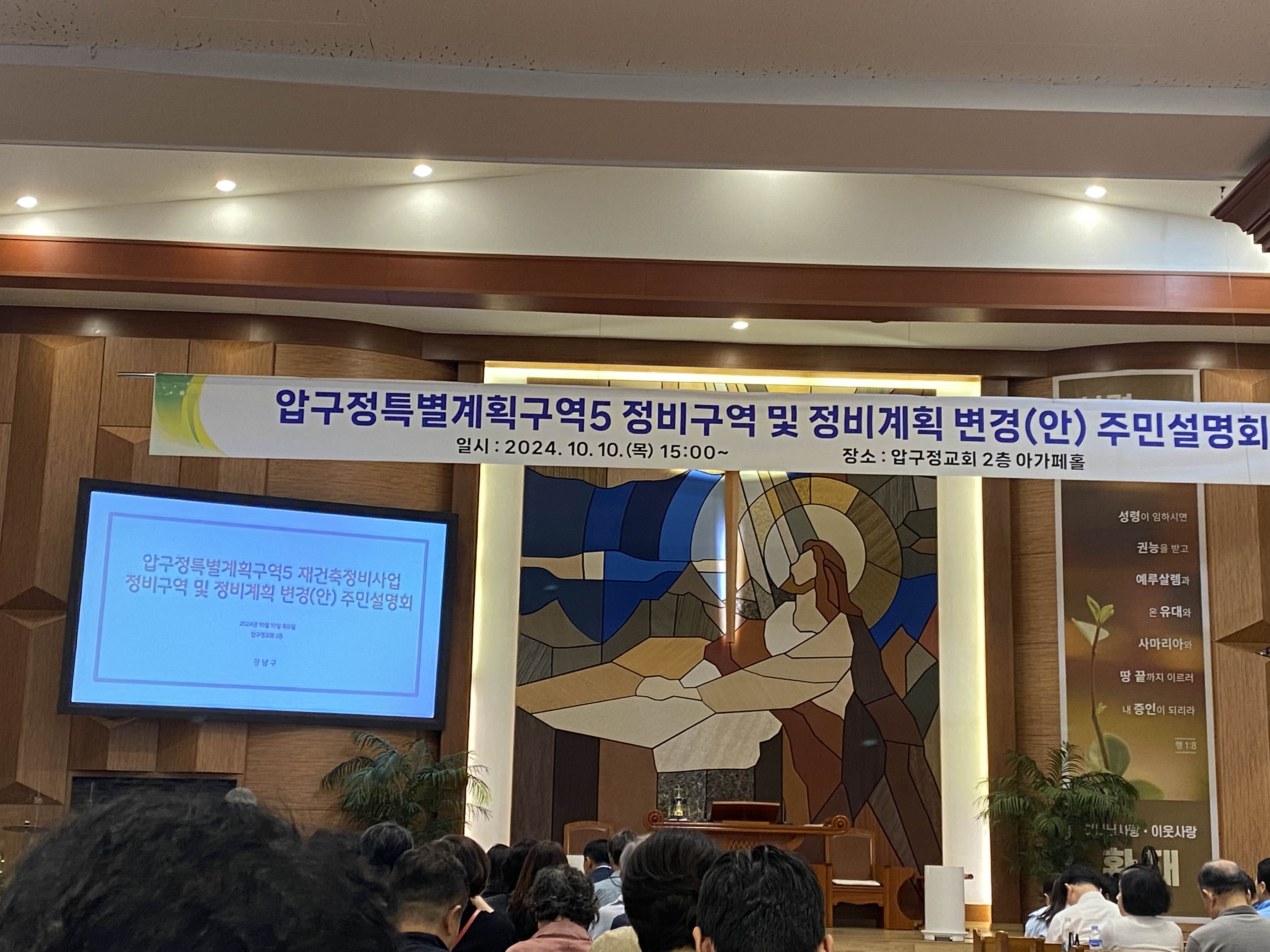 2024년 10월 10일 목요일 오후 세시부터 압구정교회 2층 아가페홀에서 압구정 특별계획 구역 5 정비구역 및 정비계획 변경(안) 주민설명회가 열렸습니다.