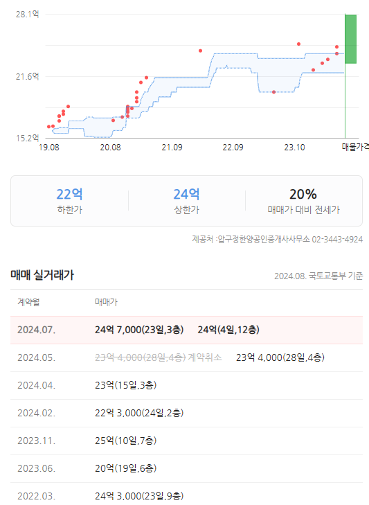 2022년부터 추이를 살펴보면 2023년 6월 20억 가장 저점을 보이고 나머지는 모두 22억, 23억, 24억대로 계속 오르는 추세를 보이고 있습니다. 가장 높은 실거래가는 2023년 11월 25억입니다. 20평이니 (정확히는 19.83평) 평당 1억 1150만원~1억 2500만원대로 추정할 수 있습니다.