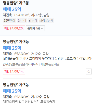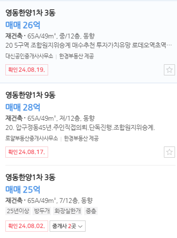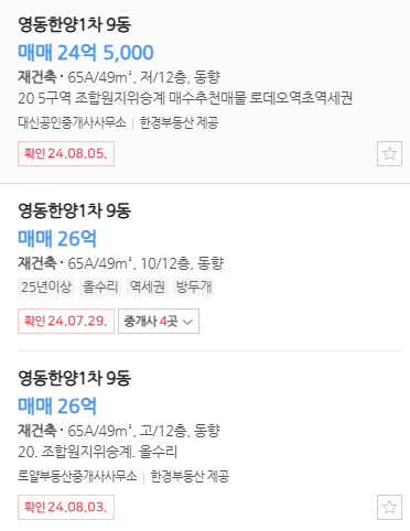 다음은 현재 네이버부동산에 나와있는 매물입니다.(2024.08.20)