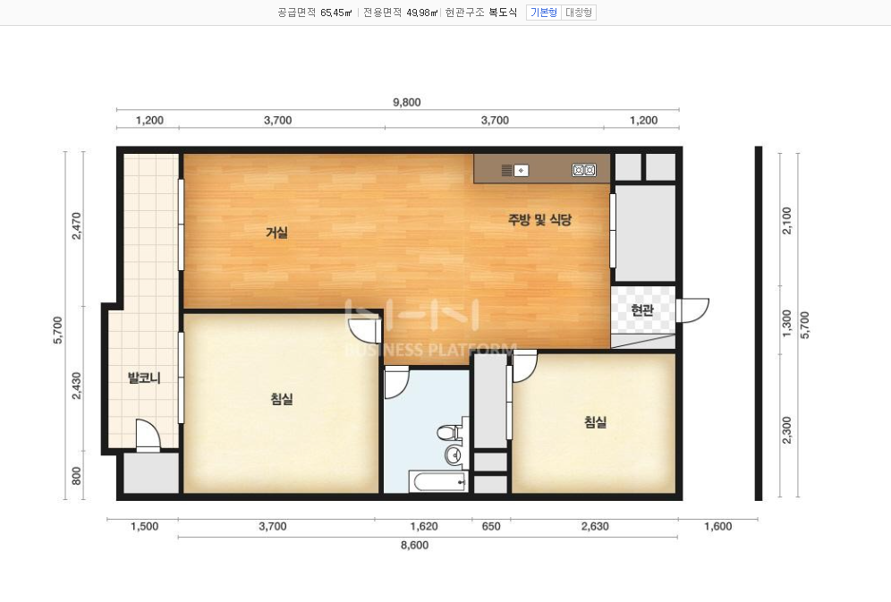 압구정한양아파트 1차 20평(65.45m2) 평면도입니다. 현관에서 들어오면 거실과 주방 및 식당이 세로로 쭈욱 이어져있고 침실이 두개, 화장실 하나, 다용도실 하나, 발코니로 이루어져있습니다.