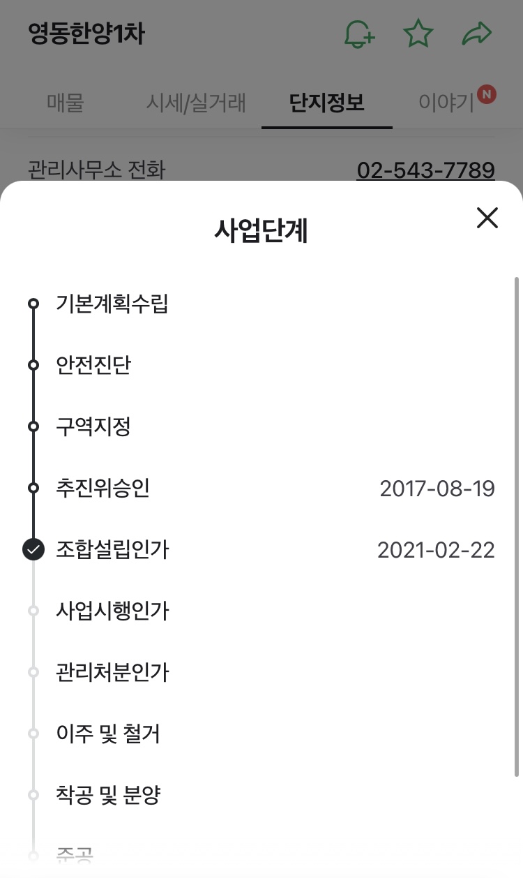기본계획수립,안전진단, 구역지정, 추진위승인, 2021년 2월 22일 조합 설립인가까지 진행되어있고 사업시행인가, 관리처분인가, 이주 및 철거, 착공 및 분양, 준공, 이전고지가 남아있는 상태입니다.