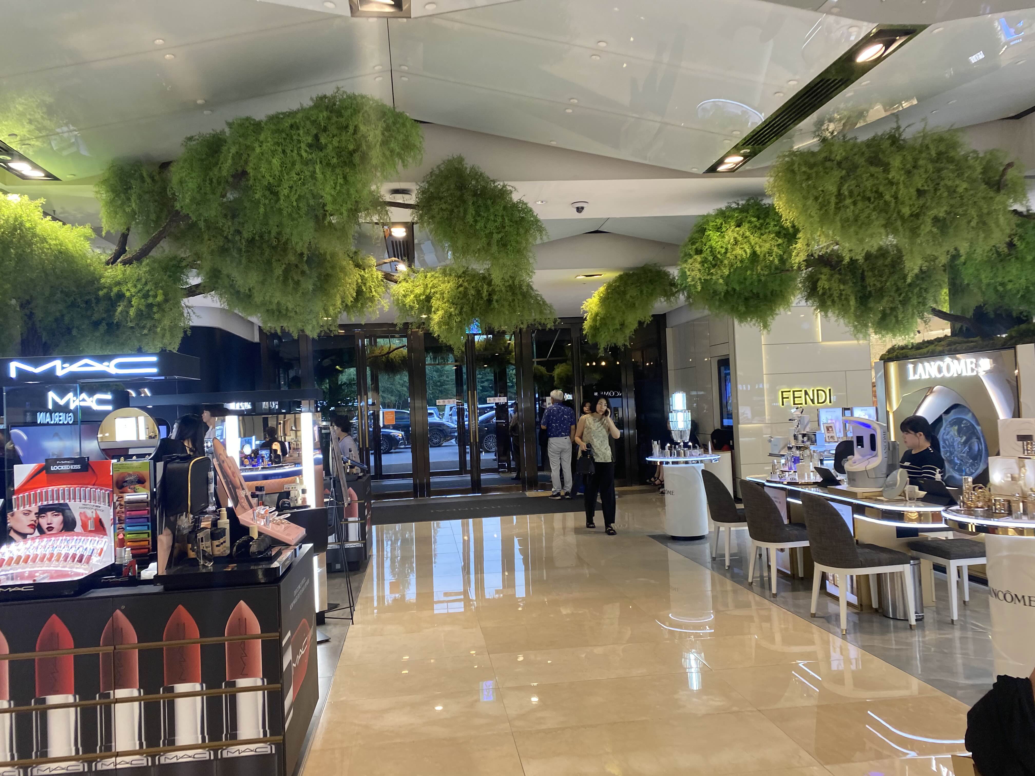 먼저 압구정 현대백화점 셔틀버스를 타러가기 위해 백화점 1층 대로변쪽 출구의 반대쪽편 출구쪽으로 가야합니다. 백화점 1층이라 화장품 매장들이 쭈욱 있습니다.