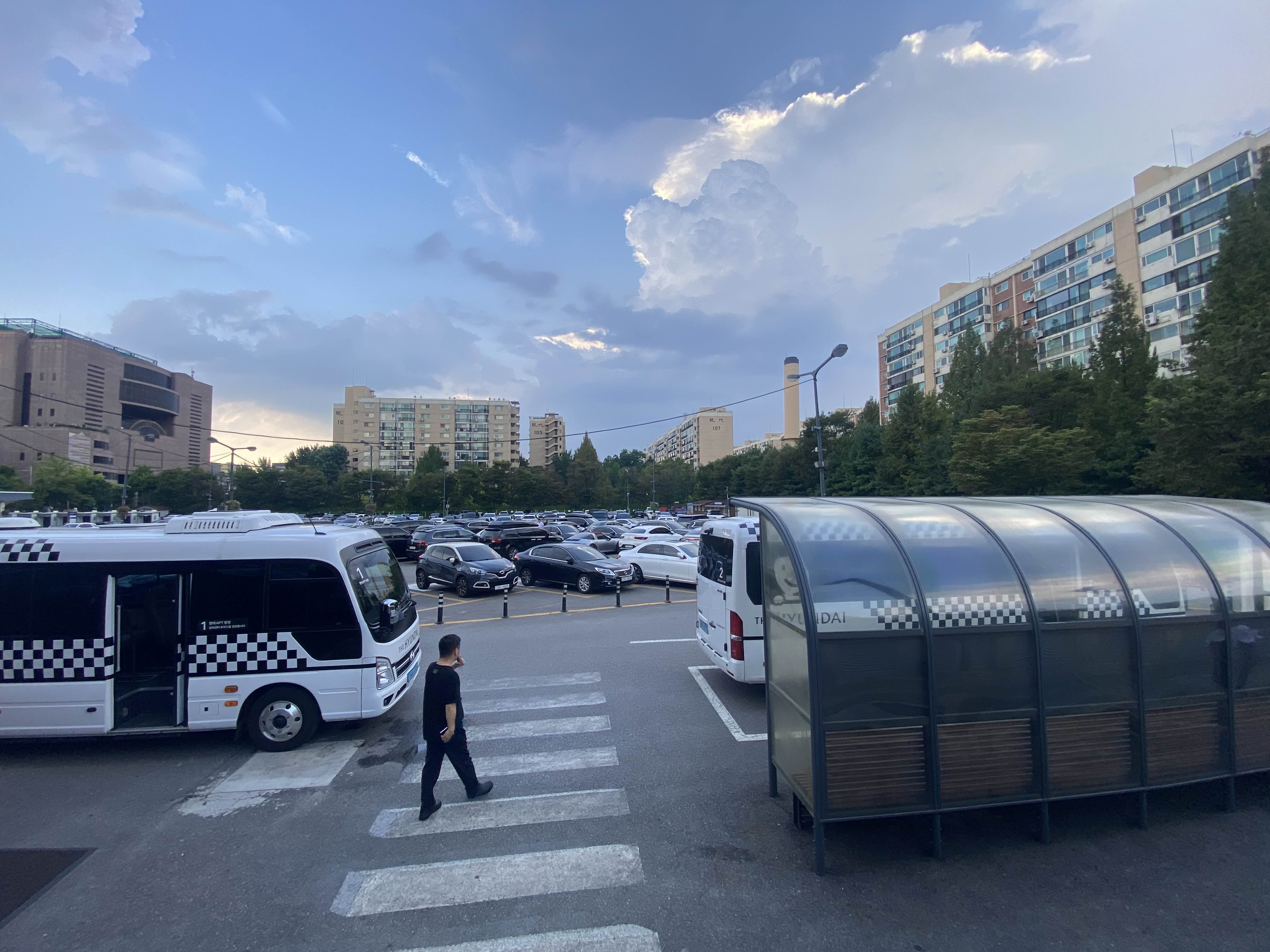 주차요원들이 서있고 작은 횡단보도를 건너면 바로 셔틀버스들이 보입니다.