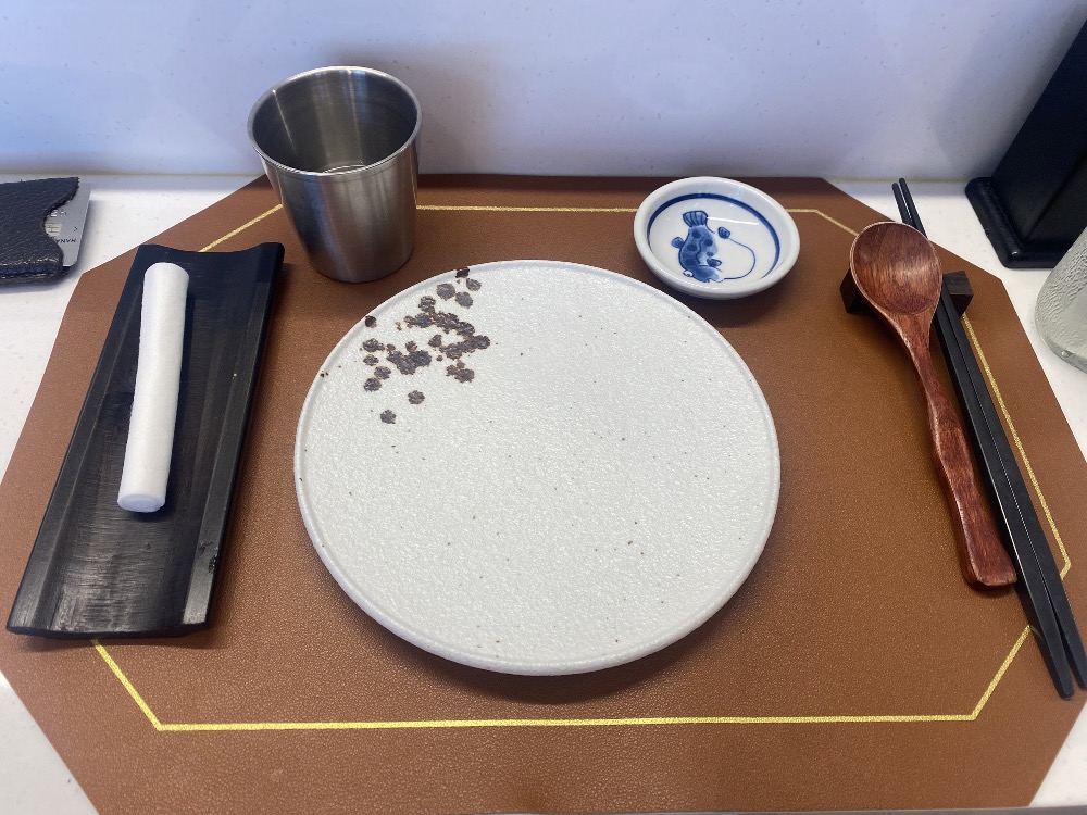 처음 입장했을 때 모습입니다. 각 자리마다 접시, 컵, 물수건, 물, 와사비가 담긴 접시가 있습니다.